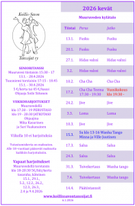 - Senioritanssikurssi torstaisin 15.1. – 30.4.2026 klo 17:15 – 18:45.